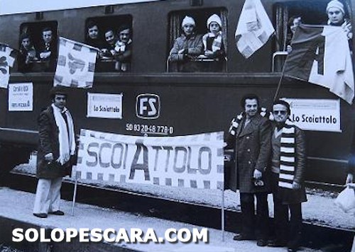 Campionato di serie B 1975-76. I tifosi del Pescara si accingono a partire per la trasferta di Piacenza del 14 marzo 1976 (Piacenza - Pescara 2-0).