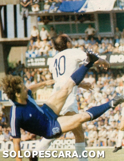 1977, Bruno Nobili in duello aereo con Brugnera in Pescara - Cagliari (0 - 0).