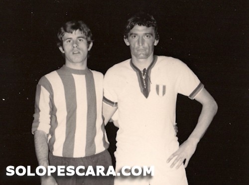 Pescara, mercoledi' 4 aprile 1971. Incontro amichevole Pescara - Cagliari (1-3). Il biancazzurro ed ex capitano cagliaritano Moro assieme al "grande" Gigi Riva.